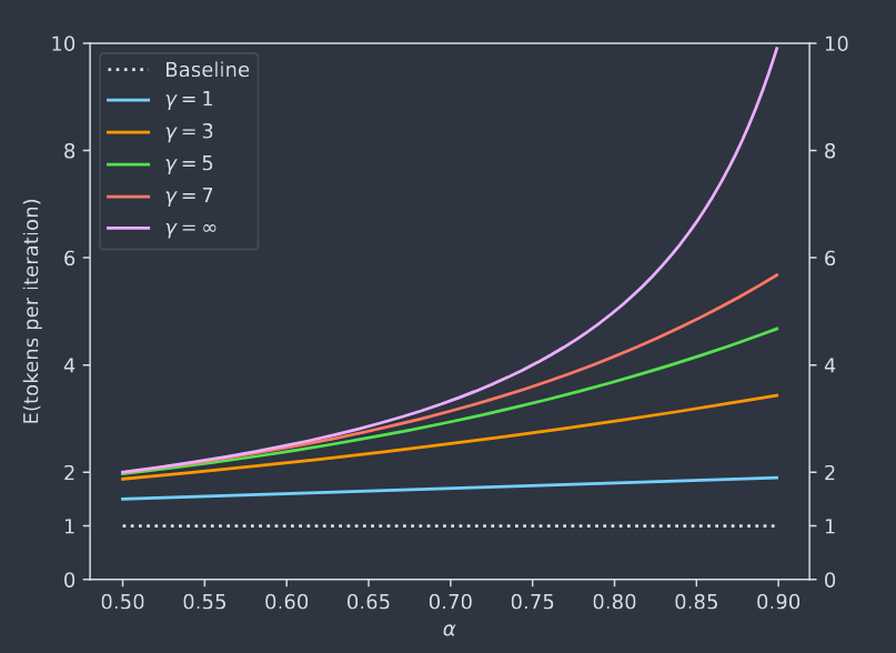- So: \(E(\#generated\ tokens)=1+\alpha+\alpha^2+...+\alpha^\gamma=\frac{1-\alpha^{\gamma+1}}{1-\alpha}\)