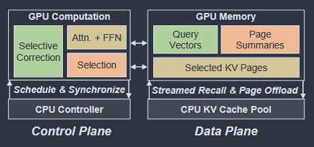 - GPU (NHD) → query vectors from the previous step, page summaries and cache for selected KV pages.