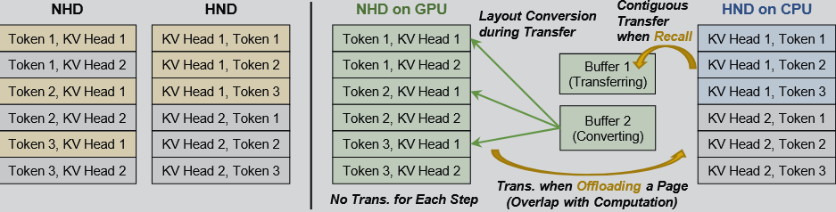 - $double-buffering$: After a selected KV page is transferred to buffer 2, its layout conversion begins immediately, while the transfer of the next page is concurrently initiated into buffer 1